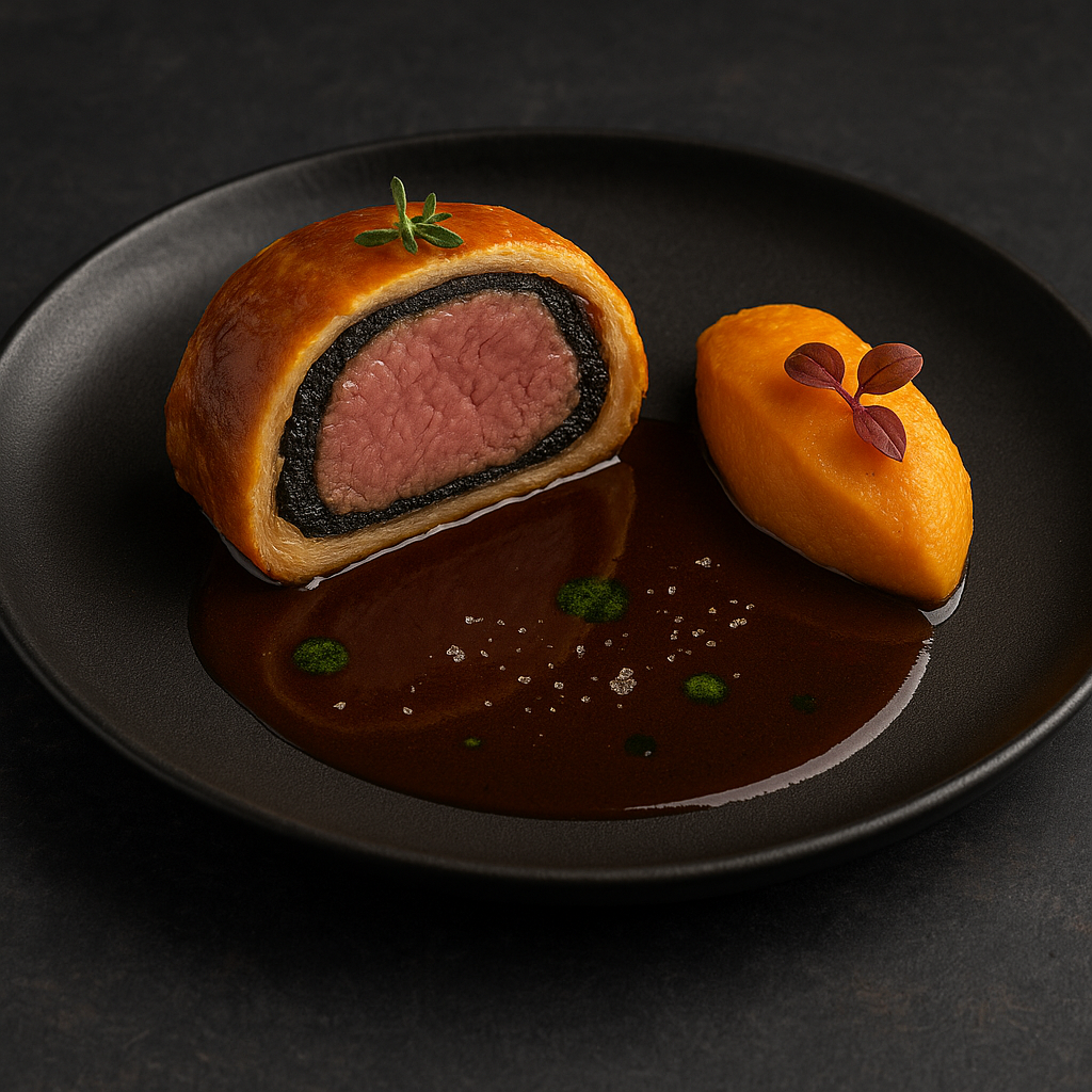 Ternera rosada, morcilla canaria, hojaldre crujiente, puré de batata ahumada y gravy al vino majorero. Técnica británica, alma isleña.