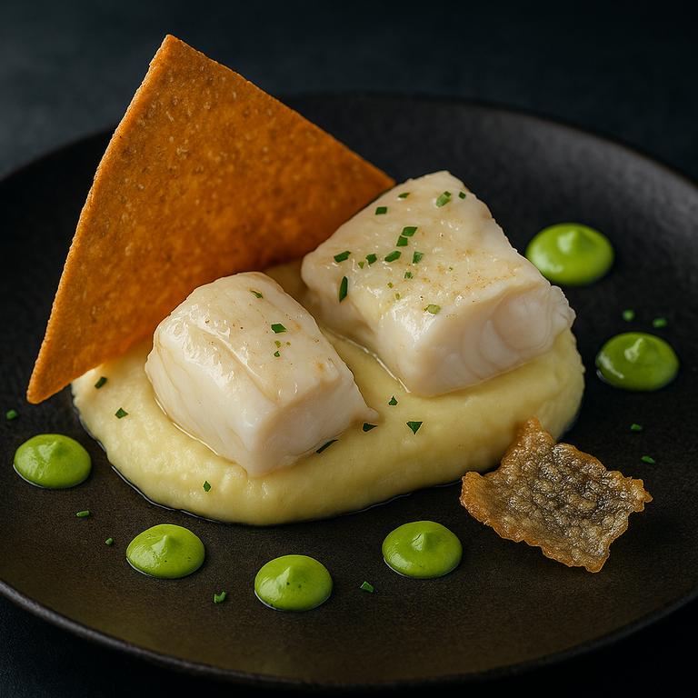 Bacalao confitado sobre crema de papas arrugás, mojo de guisantes, crujiente de gofio y chips de piel. Una oda técnica a la tradición canaria reinventada.